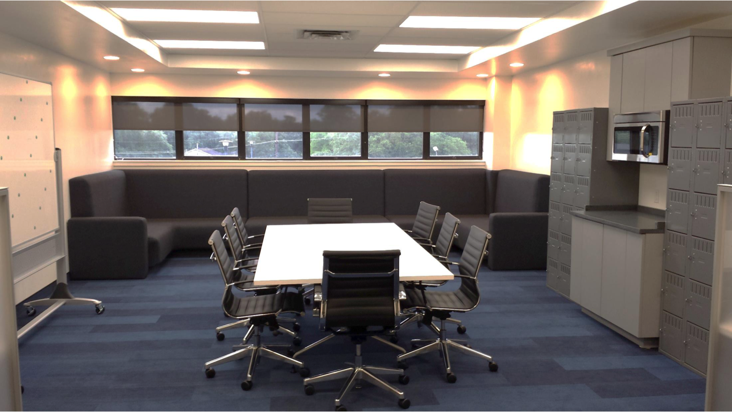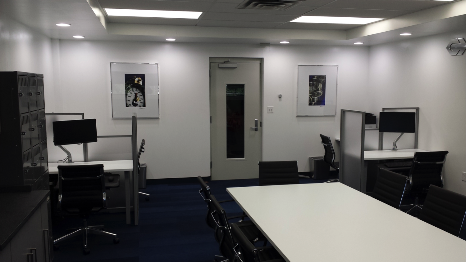 Created by Rodney Villarreal Design, the design focuses on the students’ needs and wants. Many student groups were questioned about what they would want in a student lounge and those desires were all met in a clean, functional design. The student lounge features key card access that will only allow ITEC students to gain entrance and use its’ resources. The renovation was able to provide resources which include a large conference table, computer stations with printer access and computer software used by the students in the department, a large seating area in the rear of the room, and storage lockers.
