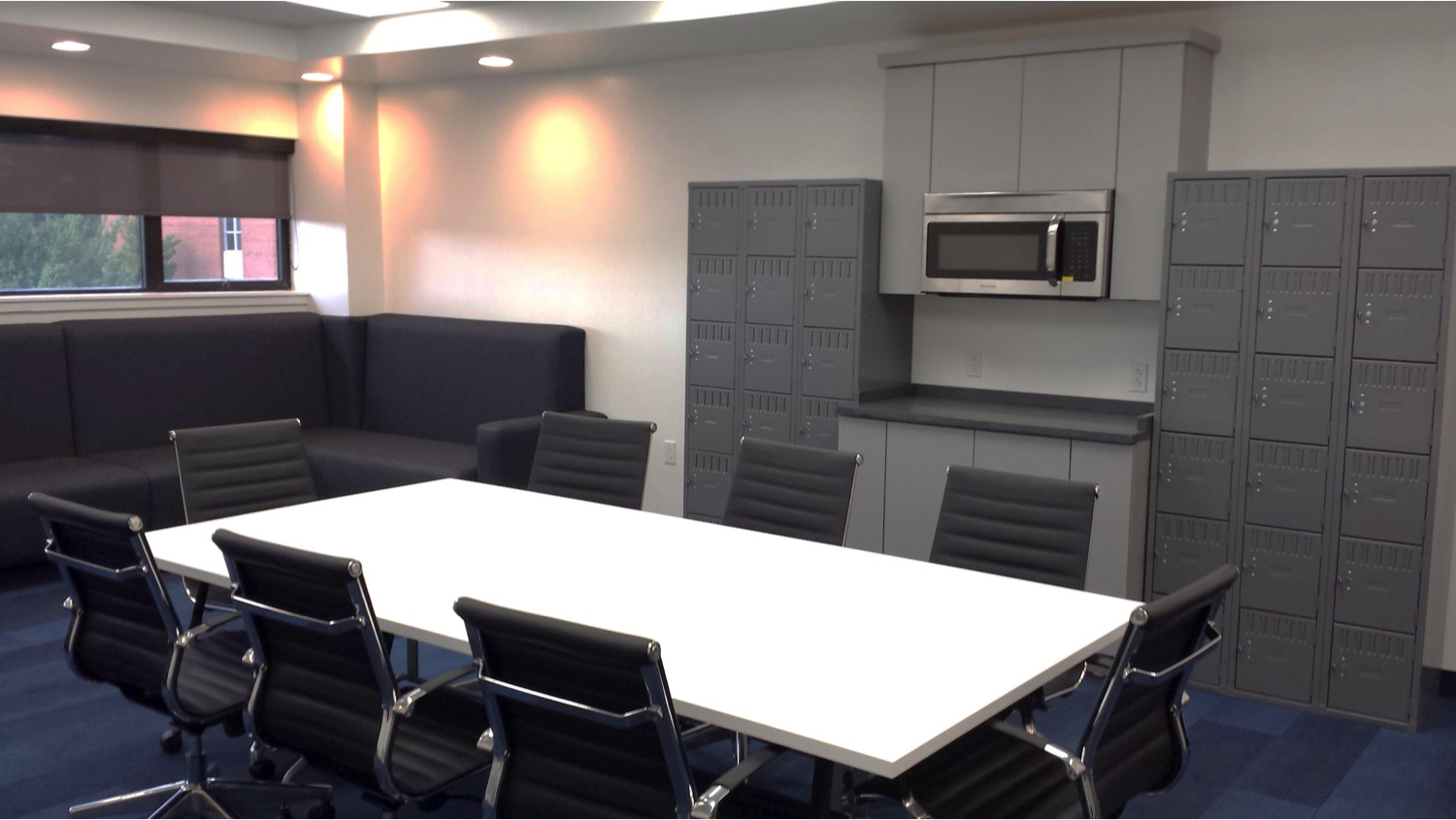Lockers are available for safely storing books and personal items. A microwave and storage cabinets are available for snack breaks