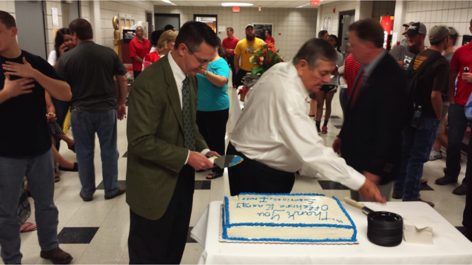 To the left in the green jacket, Mr. Charles Garber, Jr., Vice President Finance at Offshore Energy Services, Inc. with Mr. Charles Garber cutting the cake